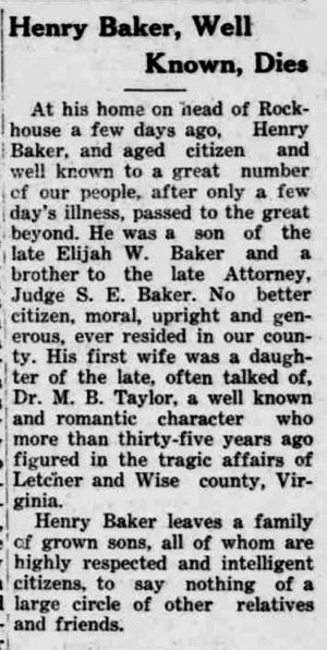 Henry Baker b 26 Feb 1858 Letcher Co KY d Sept 1929 Letcher Co KY; buried Baker Cemetery, Colson, Letcher Co KY; s/o Elijah Willis Baker and Mary S Polly Yonts. Henry Baker m. 31 Oct 1919 Letcher Co KY to (3) Lydia Angeline Parsons b 11 Jul 1854 Letcher Co KY; d/o David Parsons and Derinda Emeline Privett.